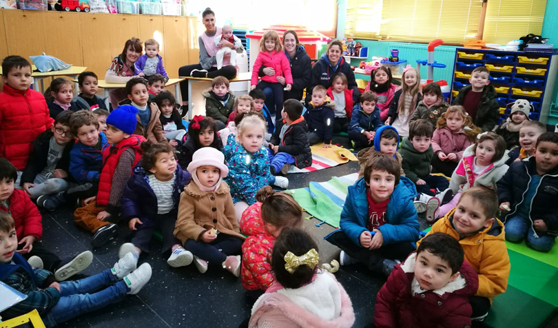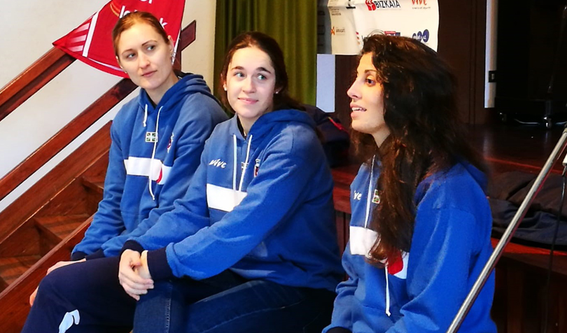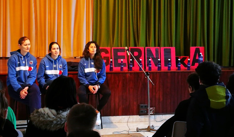 Itziar Ariztimuño, Naiara Díez y Valeriya Berezhynska acudieron al centro escolar que está más cerca del Pabellón de Maloste. La recepción fue como de auténticas estrellas. Paseillo desde la puerta de entrada con todos los alumnos del centro, desde lo más txikis y sus profesores y profesoras hasta DBH, nadie se lo quiso perder.