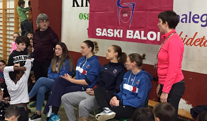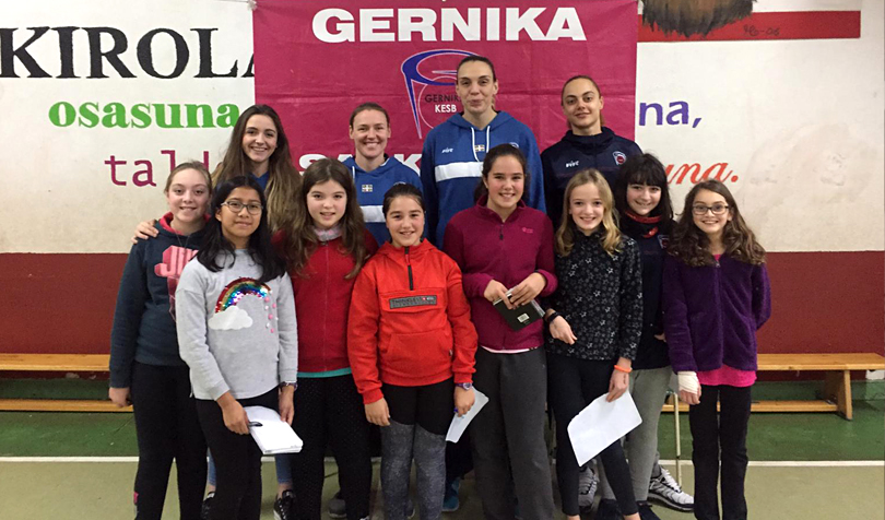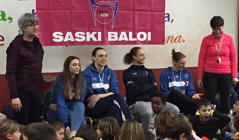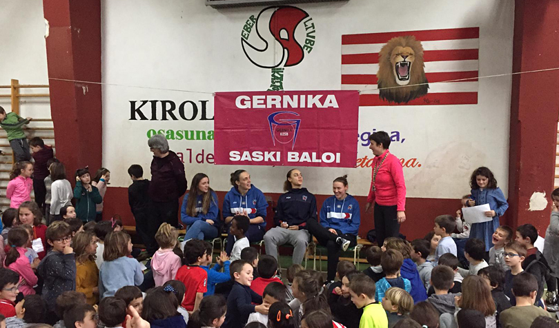 Pequeña. Así se quedó la cancha de baloncesto de la Ikastola Seber Altube ante la visita de las jugadoras del Lointek Gernika Bizkaia. Rachel Vanderwal, Jazmon Gwathmey, Luci Pascua y Nahia Anitua aprovecharon la mañana del pasado jueves para visitar el colegio gernikarra ante la cara de asombro de todas las niñas y niños que llenaron la cancha de baloncesto. Fue una visita especialmente emotiva para la joven alero ya que estudió en Seber Altube y dio ahí sus primeros pasos con el balón naranja.