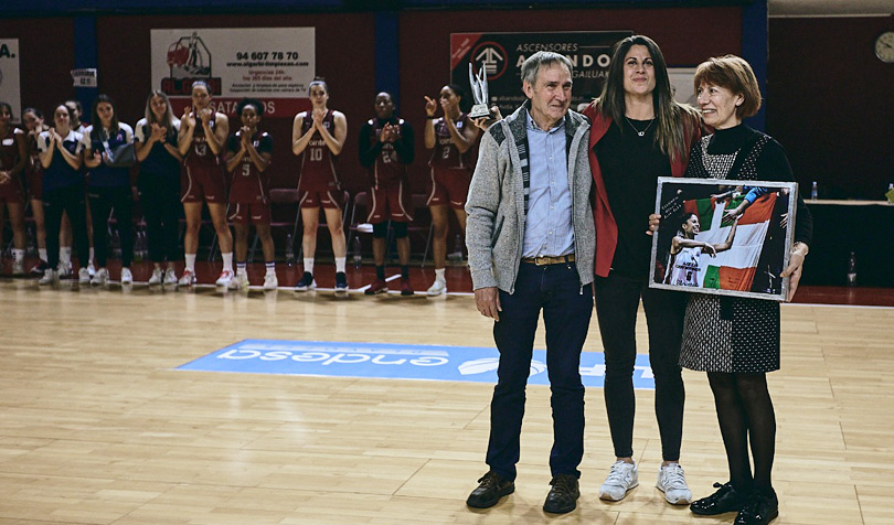 Junto a alguno de los trofeos más significativos que la propia Díez ayudó a ganar e incluso llegó a levantar, el presidente del Gernika KESB Gerardo Candina entregó a Naiara Díez el trofeo del 25 aniversario en el círculo central de un pabellón que se puso en pie para aplaudir a la jugadora de Altsasu. Emocionante también cuando su aita y su ama le entregaron un cuadro que inmortalizaba uno de esos momentos en la que Nai recibía el cariño de la grada.