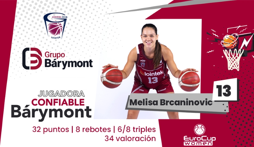 Melisa Brcaninovic ha sido la jugadora más confiable Barymont del partido de ida de las eliminatorias de la Eurocup Women. El Grupo Barymont es la empresa líder en educación, planificación y gestión financiera del país. Melisa Brcaninovic anotó 32 puntos con 6/8 en triples y capturó 8 rebotes para un total de 34 créditos de valoración en la victoria del Lointek Gernika Bizkaia ante el CBK Mersin.