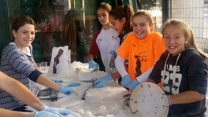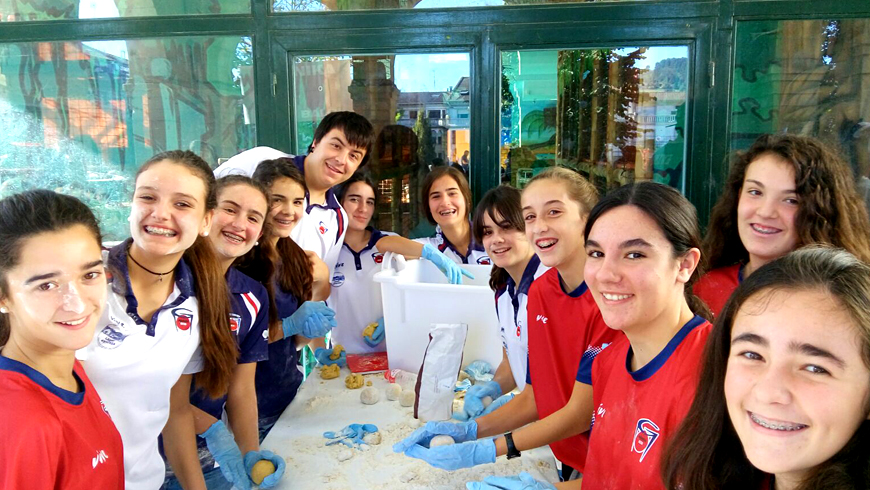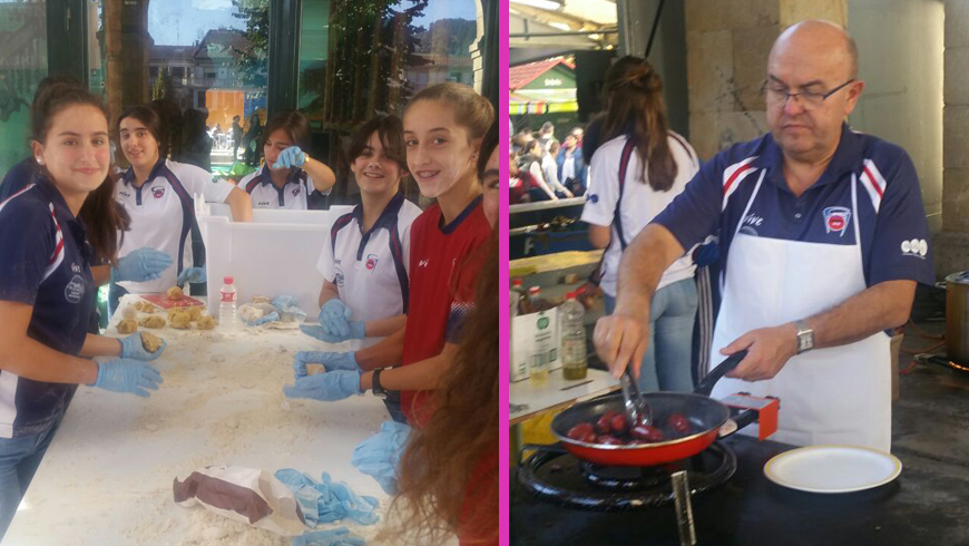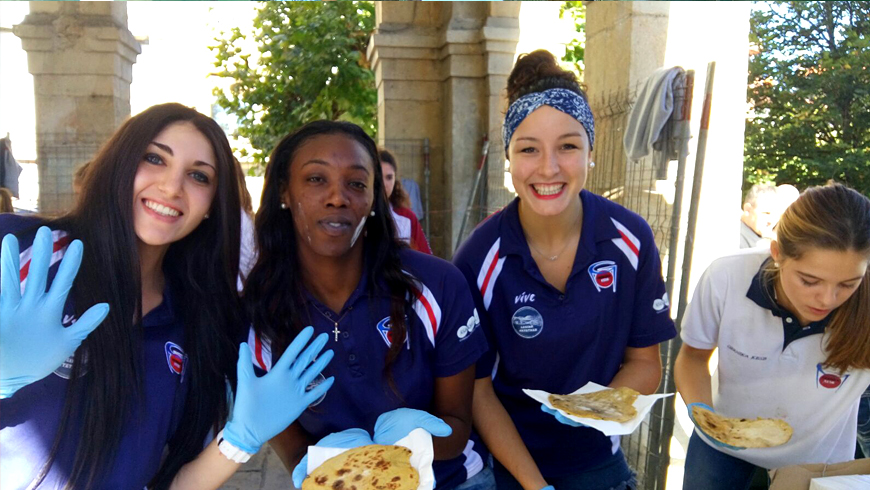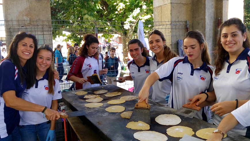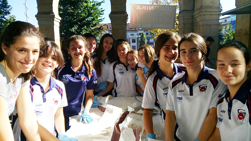 Todo el club, desde jugadoras, entrenadores, directivos, amas y aitas se han remangado para colaborar en la fiesta y ayudar a la entidad a gestionar la txosna. Servir bebidas y sobre todo hacer talo han sido las grandes tareas desarrolladas. Todas y todos se han metido en los fogones. Las más peques y jugadoras de cantera han demostrado ya su talento en esto de preparar talo. También se han metido en harina las jugadoras del equipo de Liga Femenina. La capitana Naiara Díez junto a Izaskun García ha enseñado a las ‘nuevas’ en qué consiste la fiesta y también la elaboración del talo.