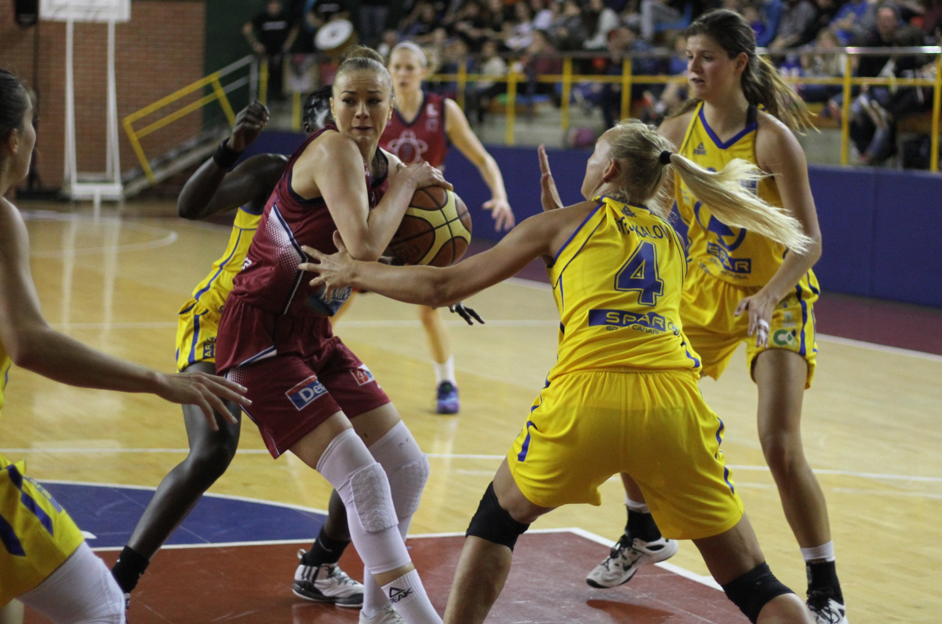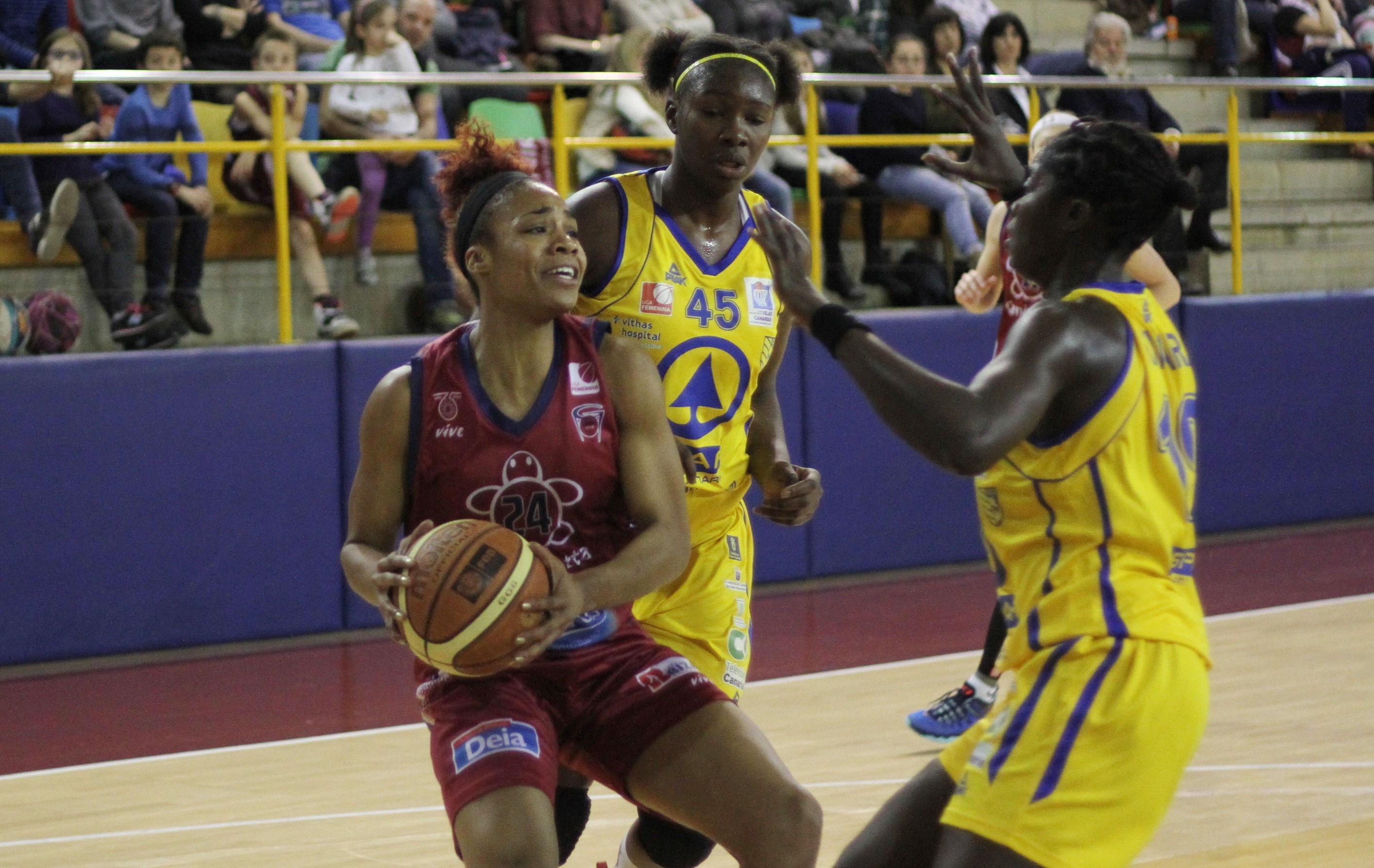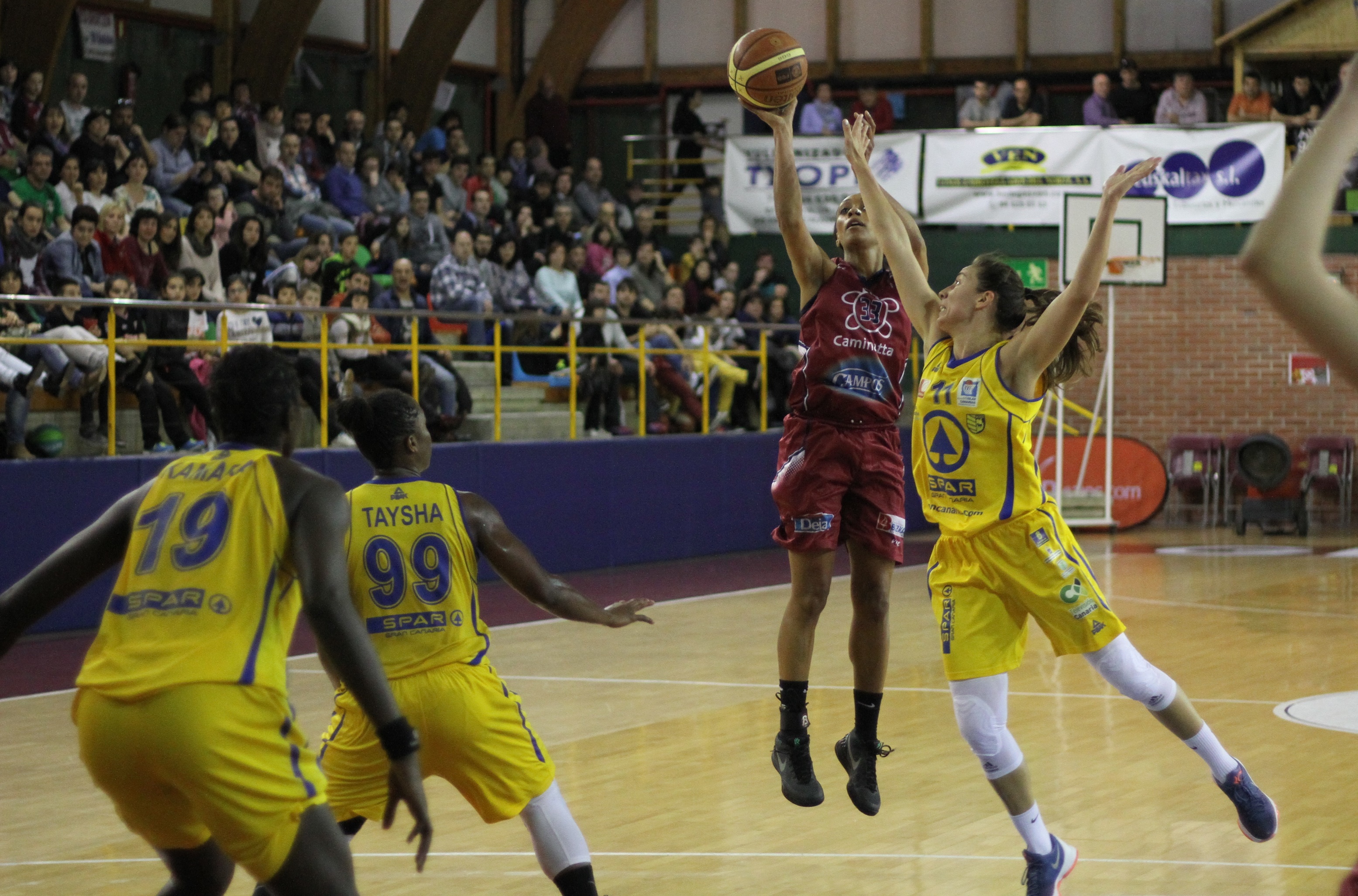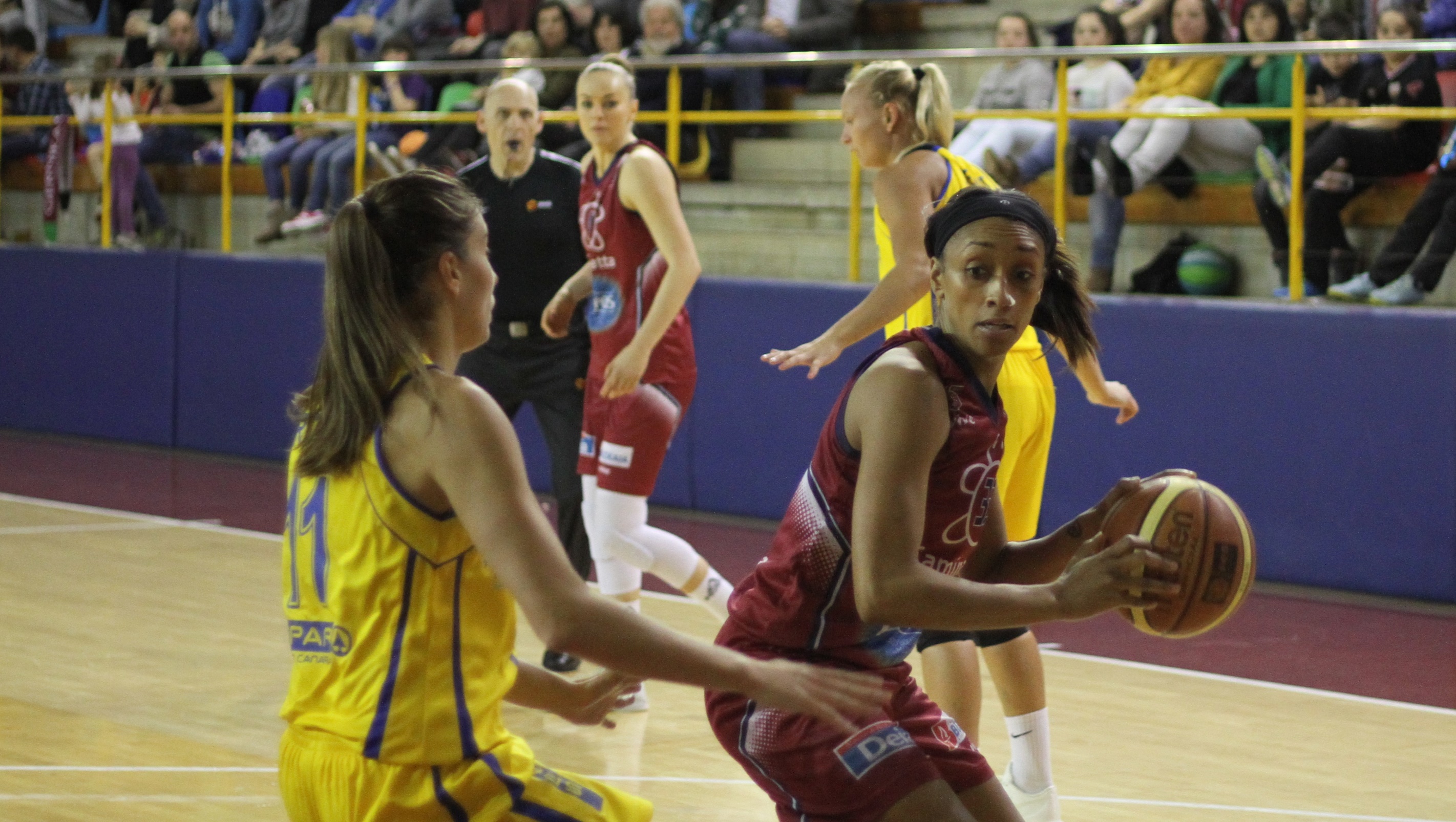 El duelo comenzó bien para las nuestras con 8 puntos de diferencia a los 5 minutos de juego, pero una sequía anotadora y desajustes en el rebote defensivo, permitieron una igualdad al final del primer cuarto con 17-13 en el marcador. El segundo cuarto continuó por los mismos derroteros. Gisela Vega y Naiara Diez eran las mejores de las nuestras con 9 y 7 puntos respectivamente. En el caso del Spar, Estela Royo era la más acertada con sus penetraciones. Al descanso se llegó con un 31-